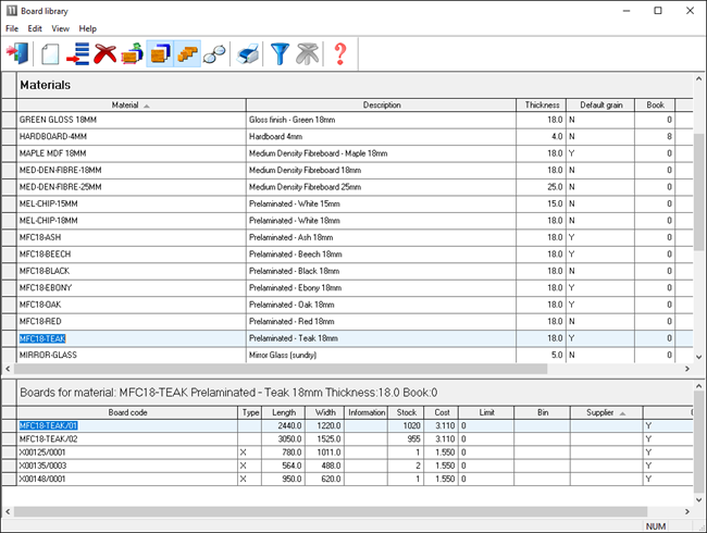- Material library including available stock of boards and offcuts – automatic issue of stock to jobs - grained/not grained.