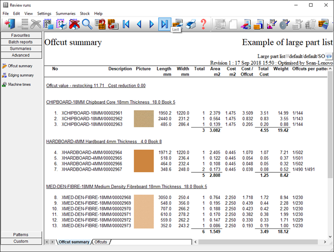 - Configurable summaries and exported files include parts produced, boards used, patterns required, offcuts produced, weights, and dashboard.