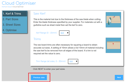 Magi-Cut Cloud now allows you to retrieve your previous optimisations from within the application. This feature is available to all users immediately. The new feature can be accessed from any of the Magi-Cut Cloud screens, simply click the “Previous Jobs” button from the bottom left of the screen (as below)