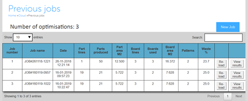 Buttons are present to the right of each job. Click “Reload” to bring the job back into the optimiser, allowing you to change the kerf, trims, parts, dimensions and materials used. Click “View results” to access the part, board and pattern summaries as existing on the date of the original run.