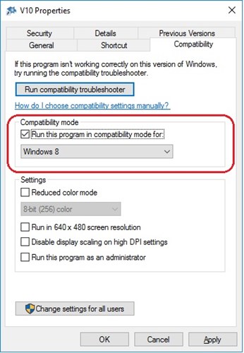 To set the compatibility mode right click on the Magi-Cut desktop icon and select Properties from the menu. In the Properties dialog select the Compatibility tab and enable Compatibility mode by setting 'Run this program in compatibility mode for:'. Select Windows 8 from the drop down menu. Select Ok to confirm and save the setting.