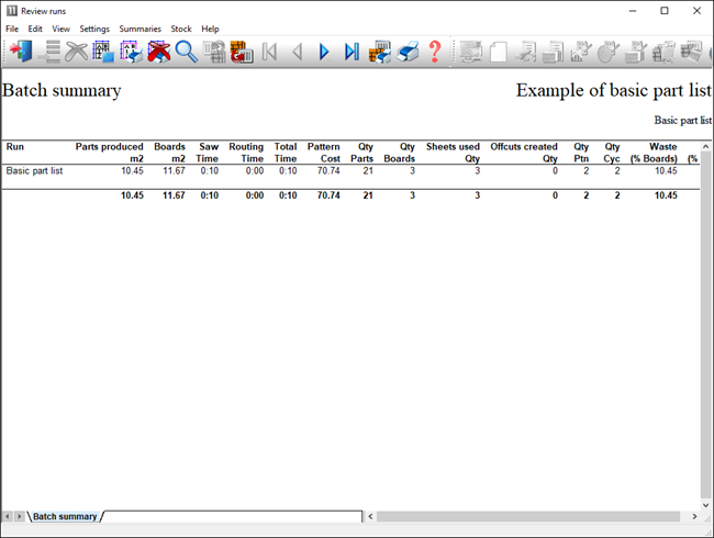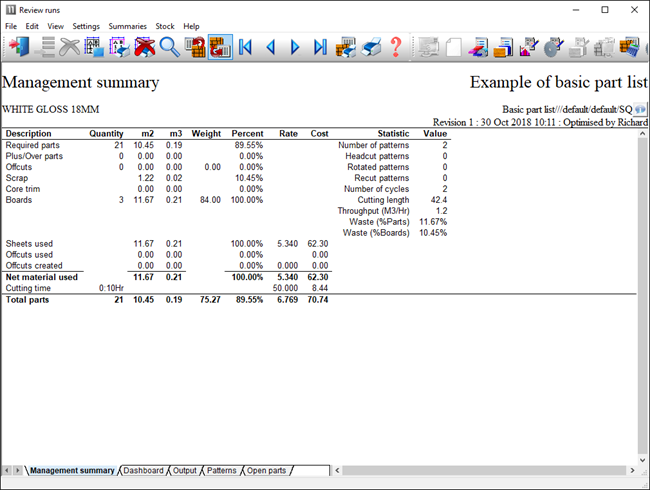 • Reports include management summary, material usage, cutting time, offcuts, costs, parts produced, waste% by pattern, weights.