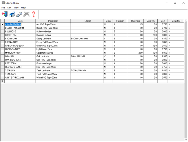 • The edging library holds description, thickness and cost of all of your edging and laminating materials including tape and solid lipping.