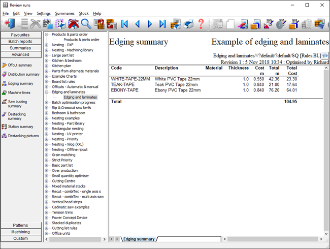 • The edging summary lists total linear measure and cost of each edge material required for each job.