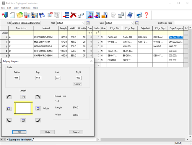 As you enter your edging details for each part you can look at the edging graphic which shows clearly which sides of the part will be edged, and also how the edges will overlap or if they are mitred.